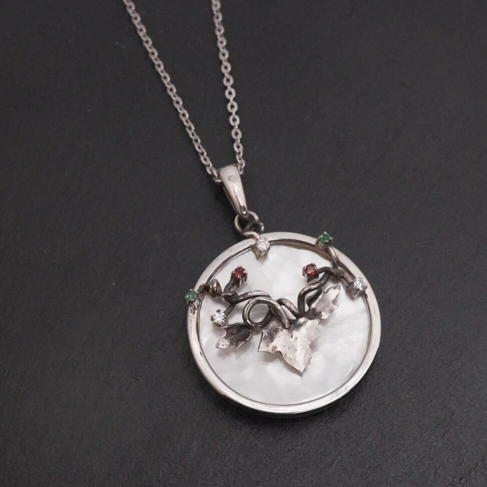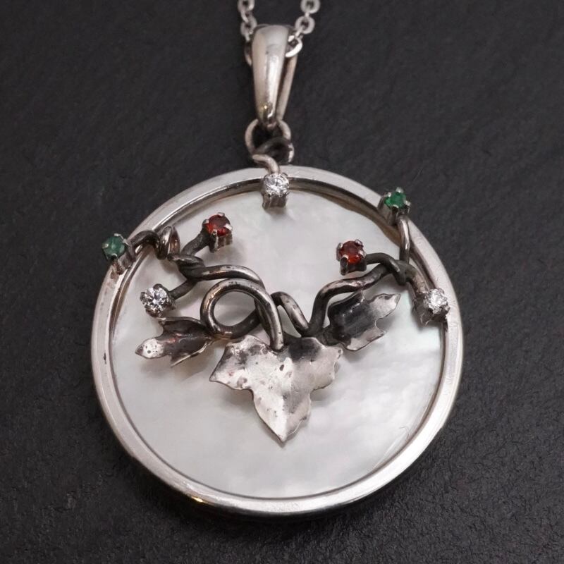 アイビーモチーフのシルバーネックレスには、ジルコニアやエメラルド、ガーネットの輝きが施されています。上品で華やかなデザインは、どんなコーディネートにもピッタリ。さりげないアクセントとして、日常使いからパーティーシーンまで幅広くお楽しみいただけます。