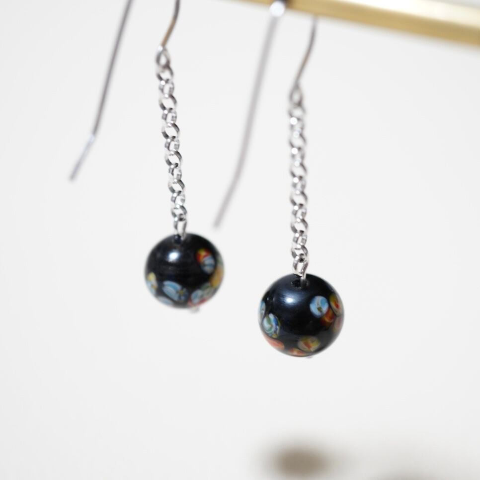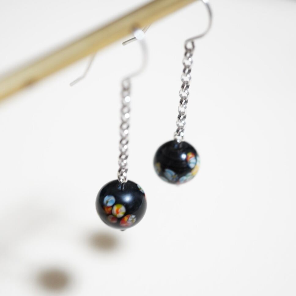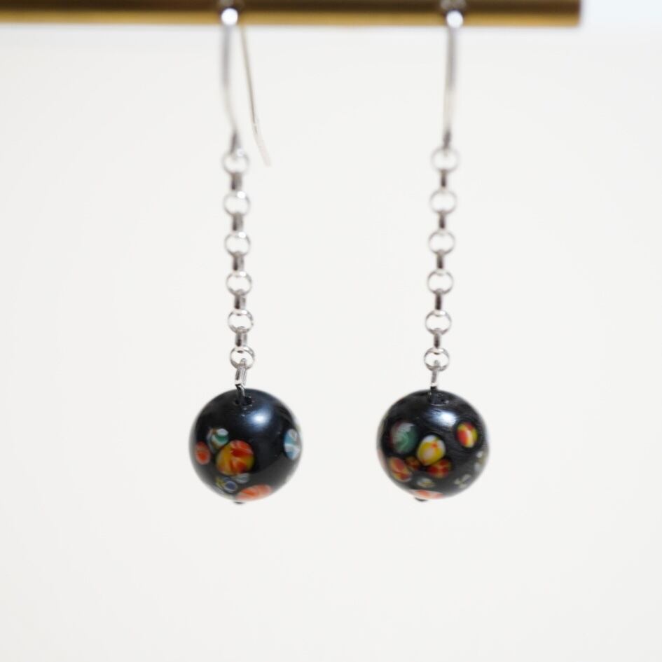 黒色 とんぼ玉 揺れるピアスは、カラフル模様が黒色の背景に映える、可愛らしいデザインが魅力です。耳元で揺れるとんぼ玉が、動きをプラスして華やかさを演出してくれます。洋服のスタイリングに合わせやすく、日常使いから特別な場面まで幅広くお楽しみいただけます。