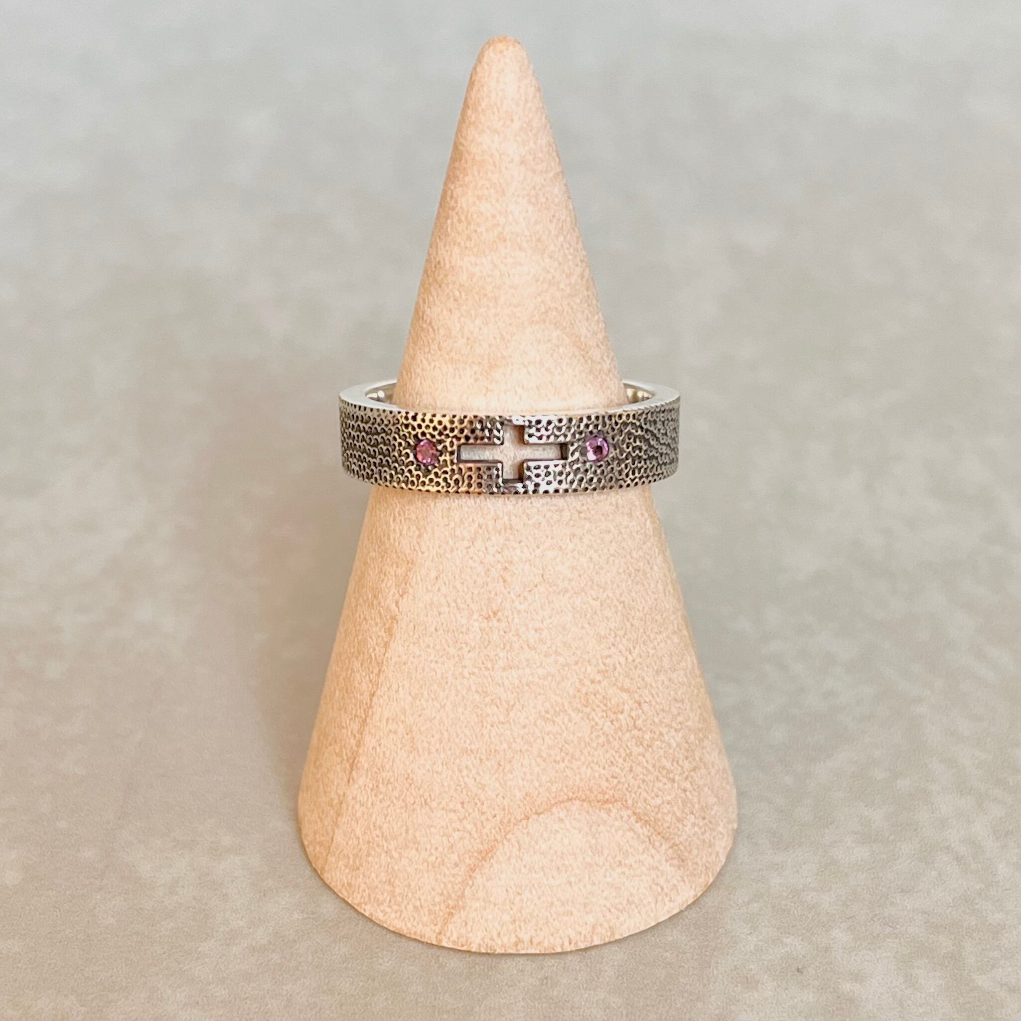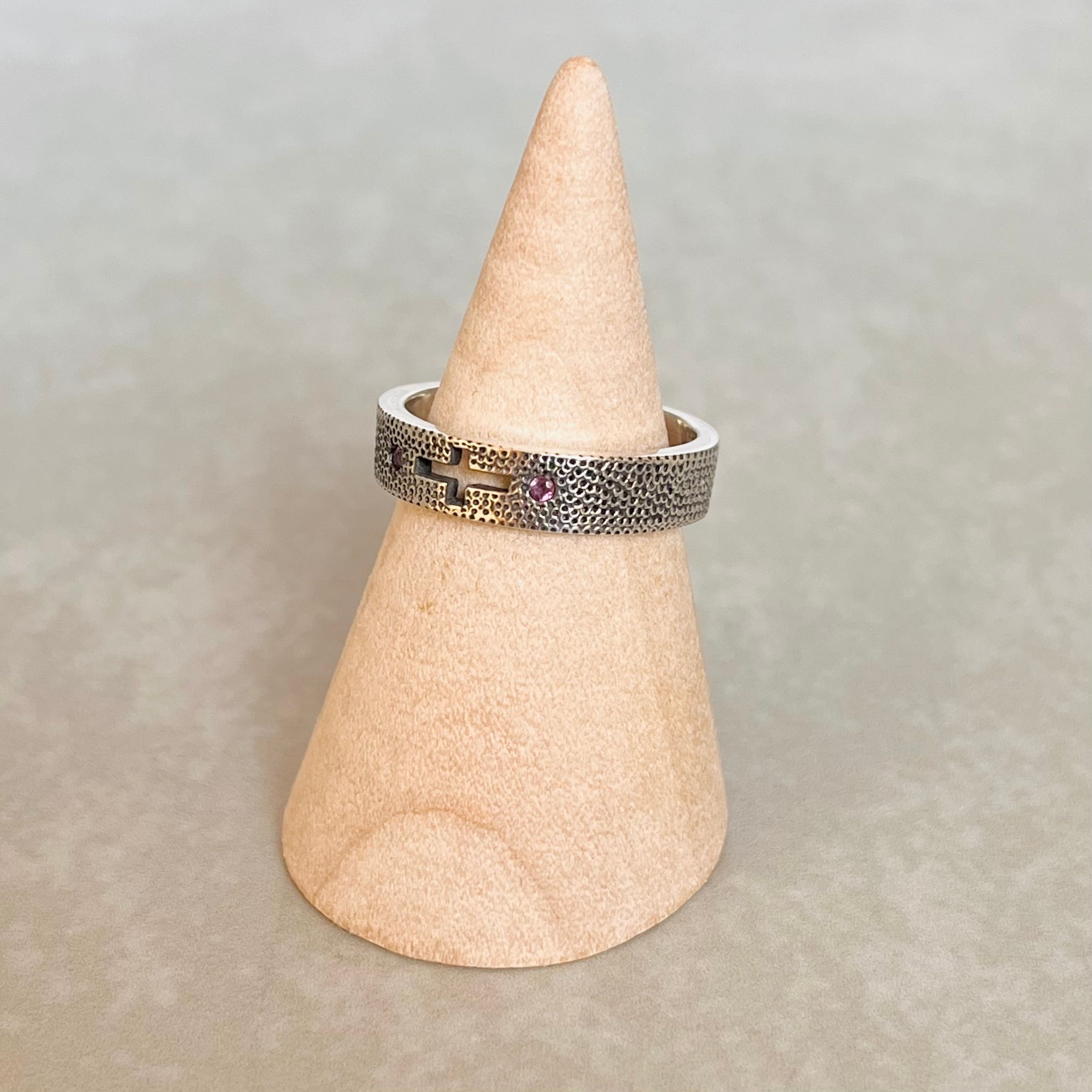 上品な輝きが魅力のロードライトガーネットと、大人の雰囲気漂うクロスの型抜きが特徴のシルバーリング。オシャレを楽しむ大人女性にぴったりなアクセサリーです。