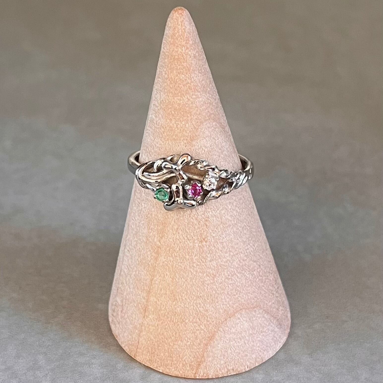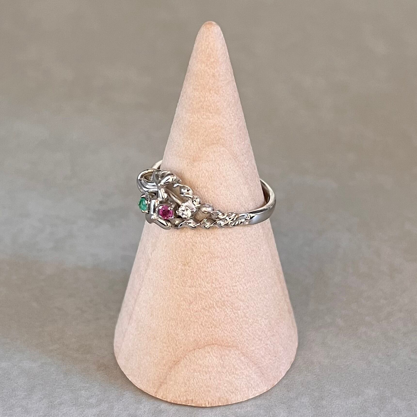 エメラルド、ルビー、ジルコニアがきらめく、美しいシルバーリング。女性らしいデザインで指先を華やかに彩ります。特別な日の装いにぴったりのアイテムです。