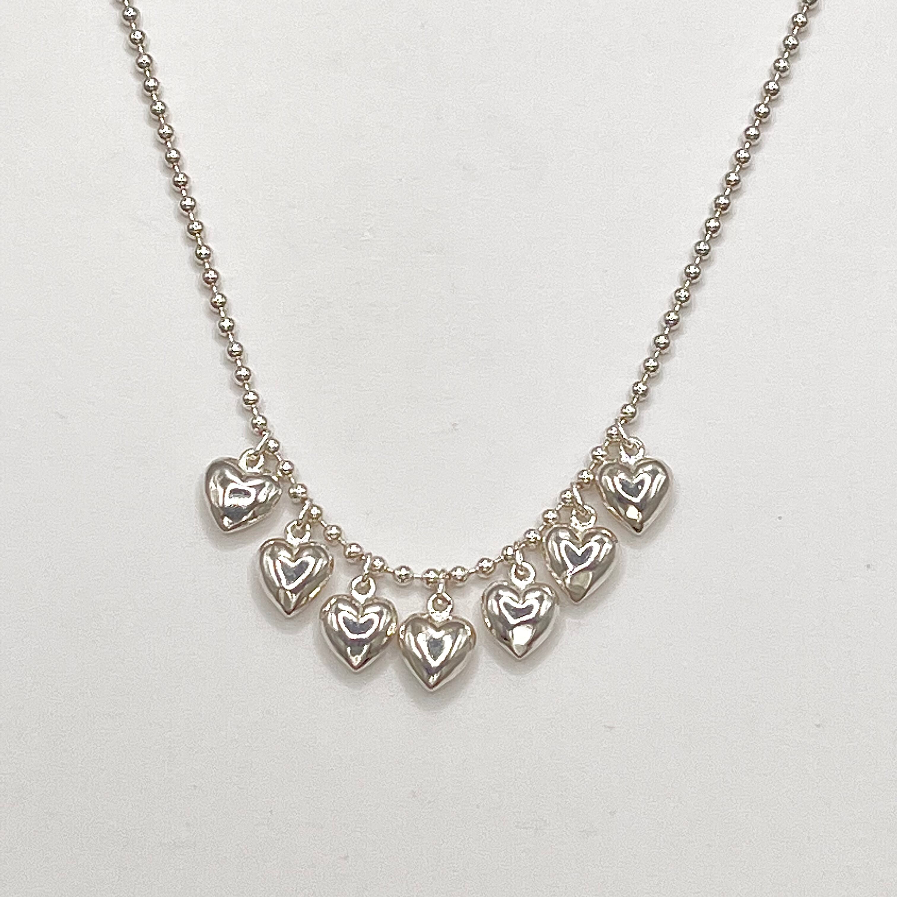 この小粒ハートのシルバーネックレスは、7つのハートが揺れるたびに可愛らしさを演出します。シンプルながらも個性的なデザインが、どんなスタイルにもマッチしてくれる一品です。シルバーの輝きが華やかさを引き立て、首元を上品に飾ります。