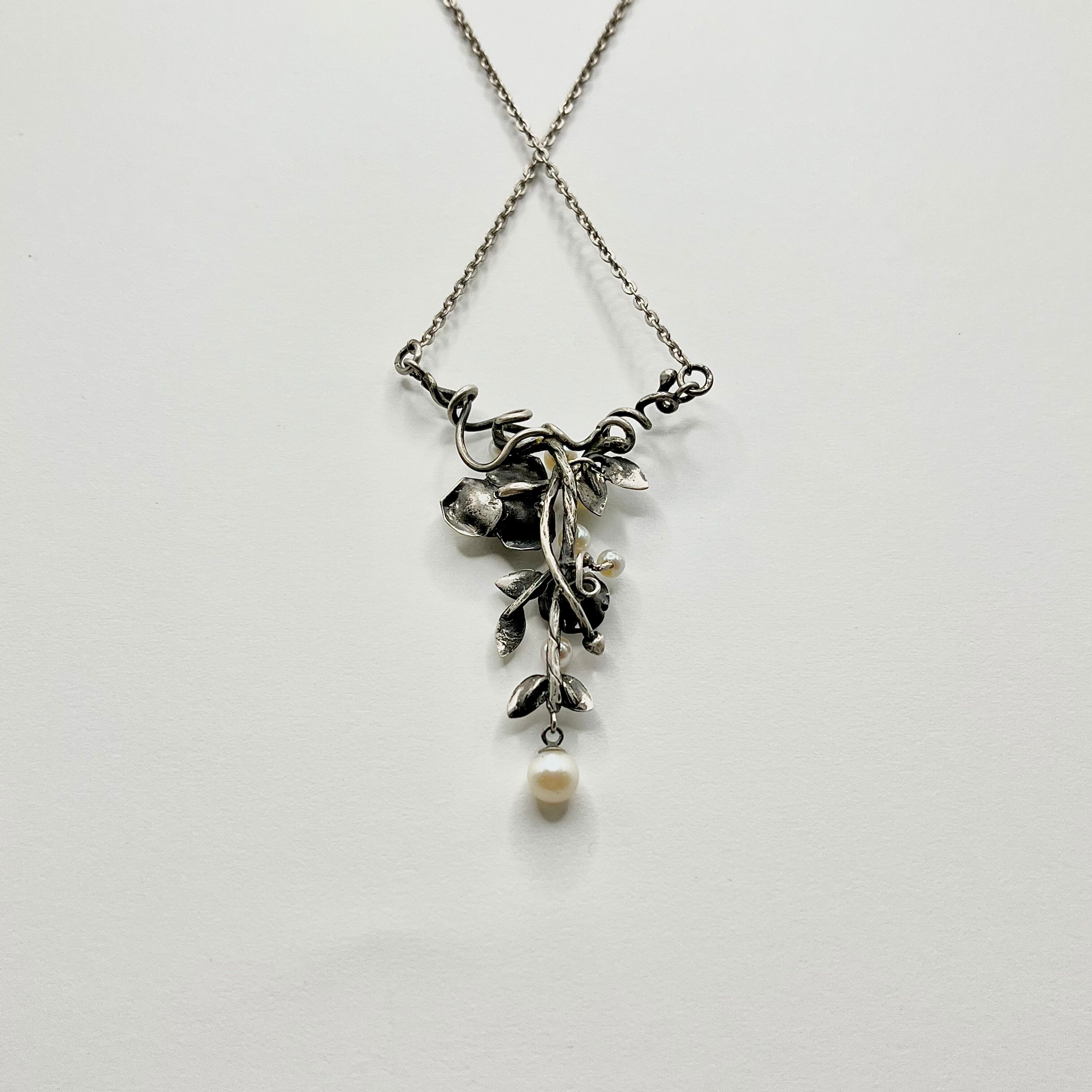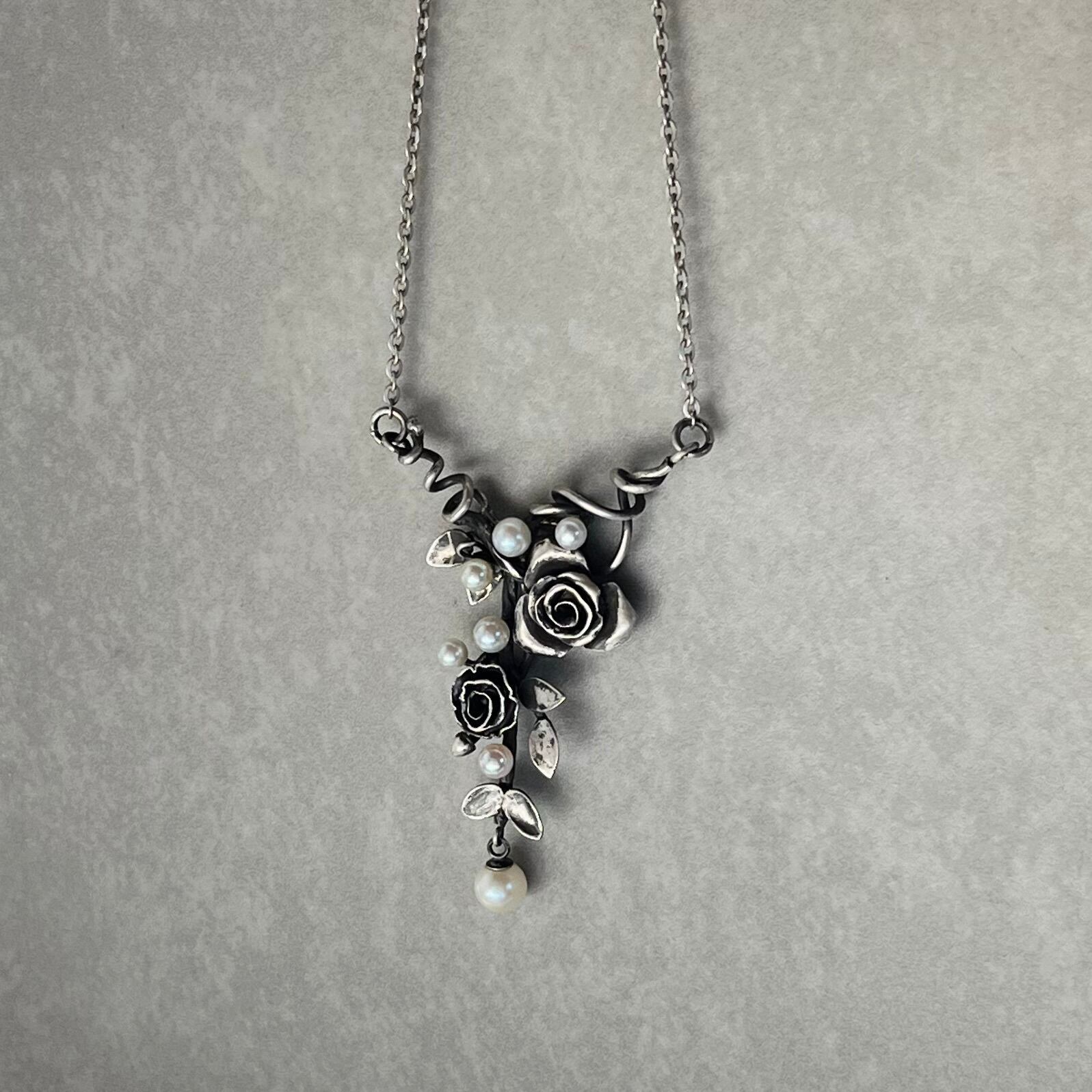 バラのシルバーネックレスは、朝露で輝くローズガーデンを思わせる美しいデザインが魅力です。古い銀細工のような風合いを出すために古美加工を施し、アンティーク調の仕上がりにこだわりました。一点ものをお探しの方には特におすすめの逸品です。
