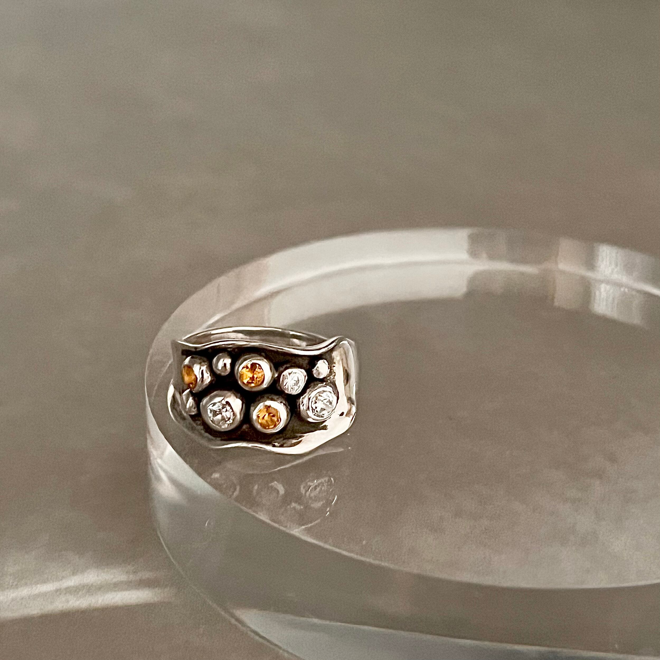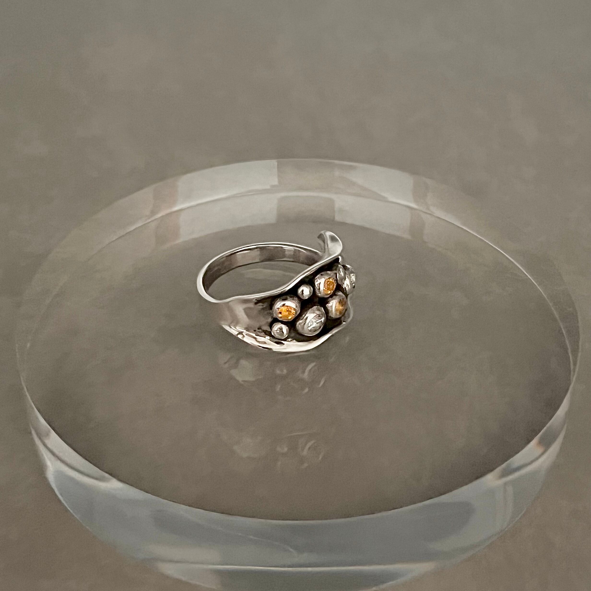 シトリントパーズとジルコニアが贅沢に散りばめられた古美加工リング。14号のサイズで、指元を華やかに彩ります。シトリントパーズは、幸福感や豊かさを引き寄せると言われ、ジルコニアは輝きが美しい人造ダイヤモンドとして知られています。古美加工が施されているので、ヴィンテージ感漂うデザインがおしゃれなアクセントに。
