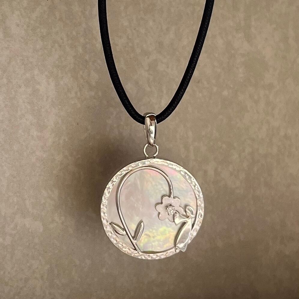 フェアリーとフラワーのデザインが可愛らしい、ジルコニアのフェアリーネックレス。洋服にも和服にも合わせやすいデザインで、華やかな雰囲気を演出します。胸元で揺れる小さなフェアリーと花のモチーフが、まるでおとぎ話から飛び出してきたような幻想的な雰囲気を醸し出します。また、背景にあしらわれたあこや貝が虹色に輝くため、どんな光の加減でも美しい輝きを放ちます。