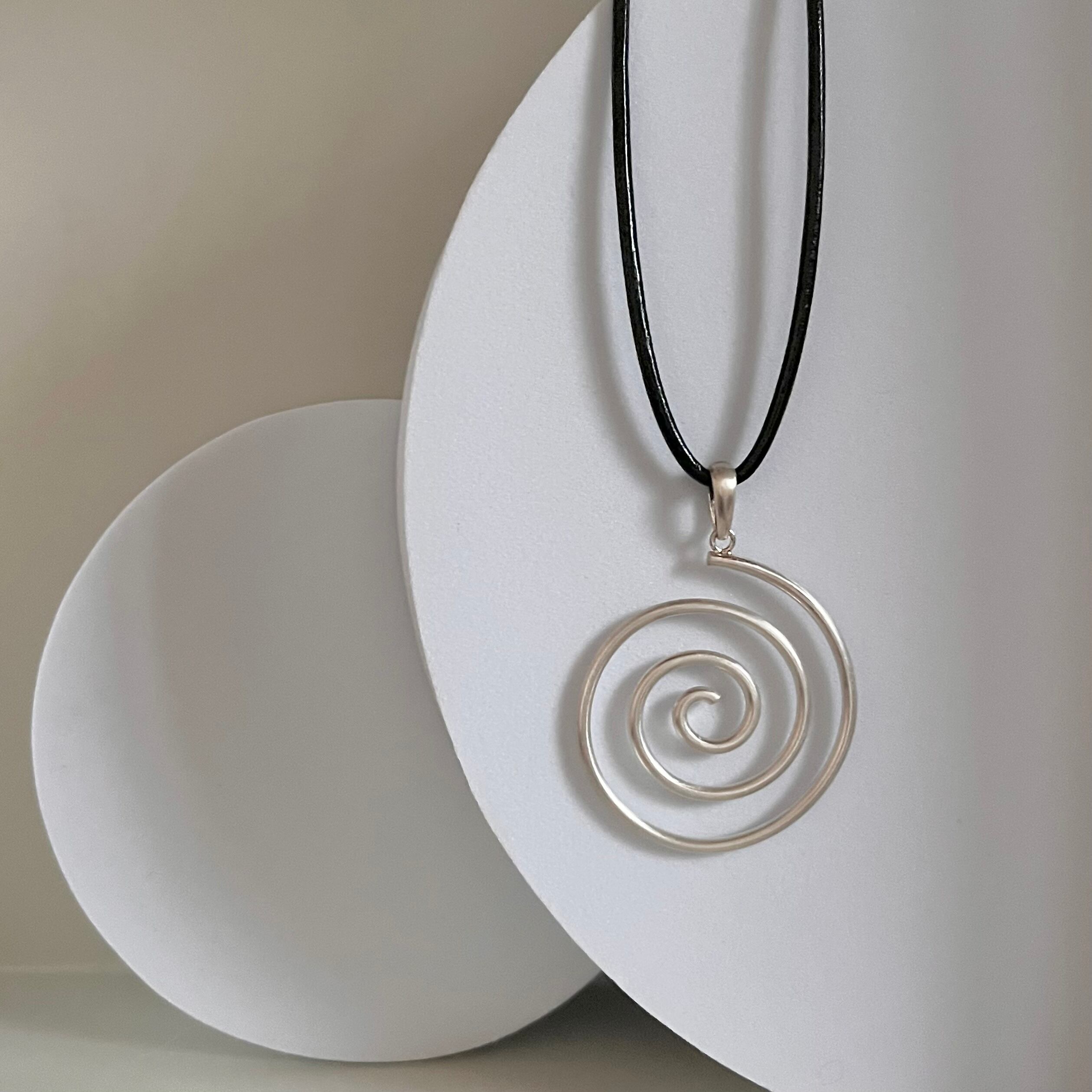 クルリネックレスは、つや消しのシルバーと革紐の組み合わせがお洒落なアイテムです。くるりと回るラインが綺麗で、どんなファッションにも合わせやすいネックレスです。