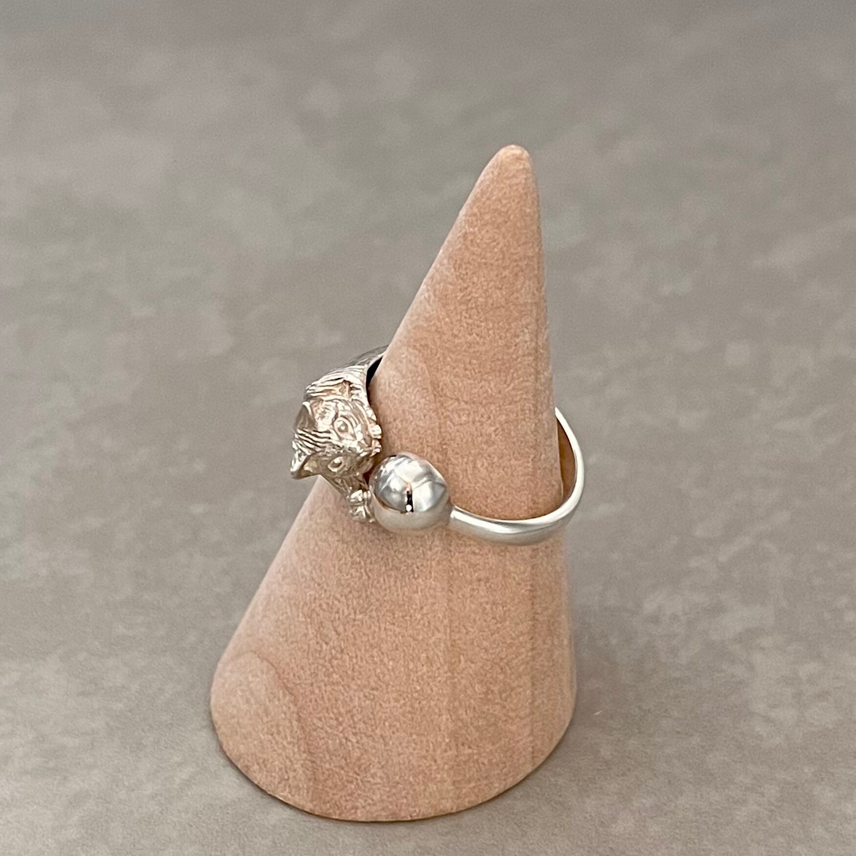 ボールで遊ぶ猫をモチーフにした、可愛らしいシルバーリングが登場しました!リアルな表情と仕草が愛らしい猫のシルエットが、指先を華やかに彩ります。シンプルだけど遊び心を感じさせるデザインは、日常使いにもぴったりです。