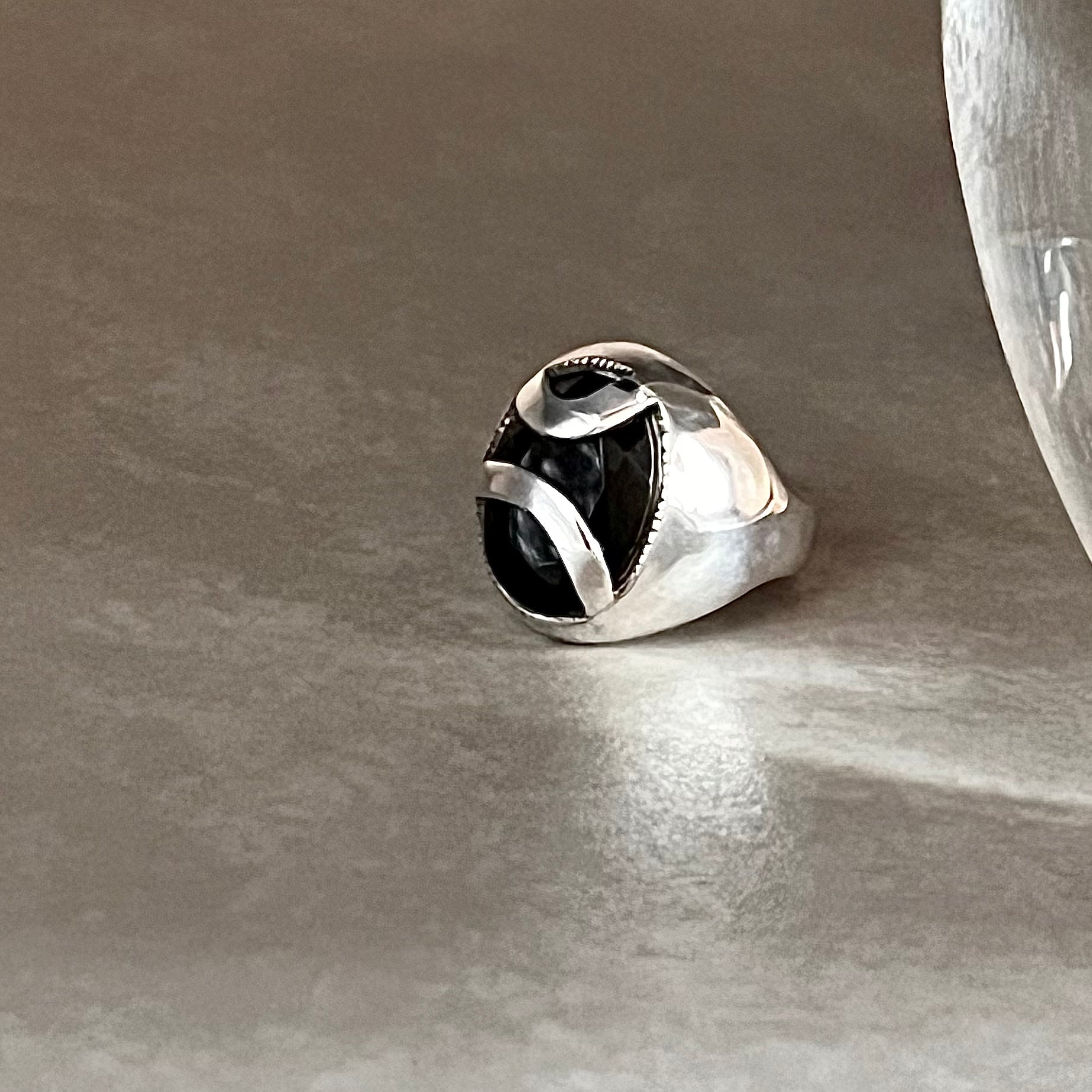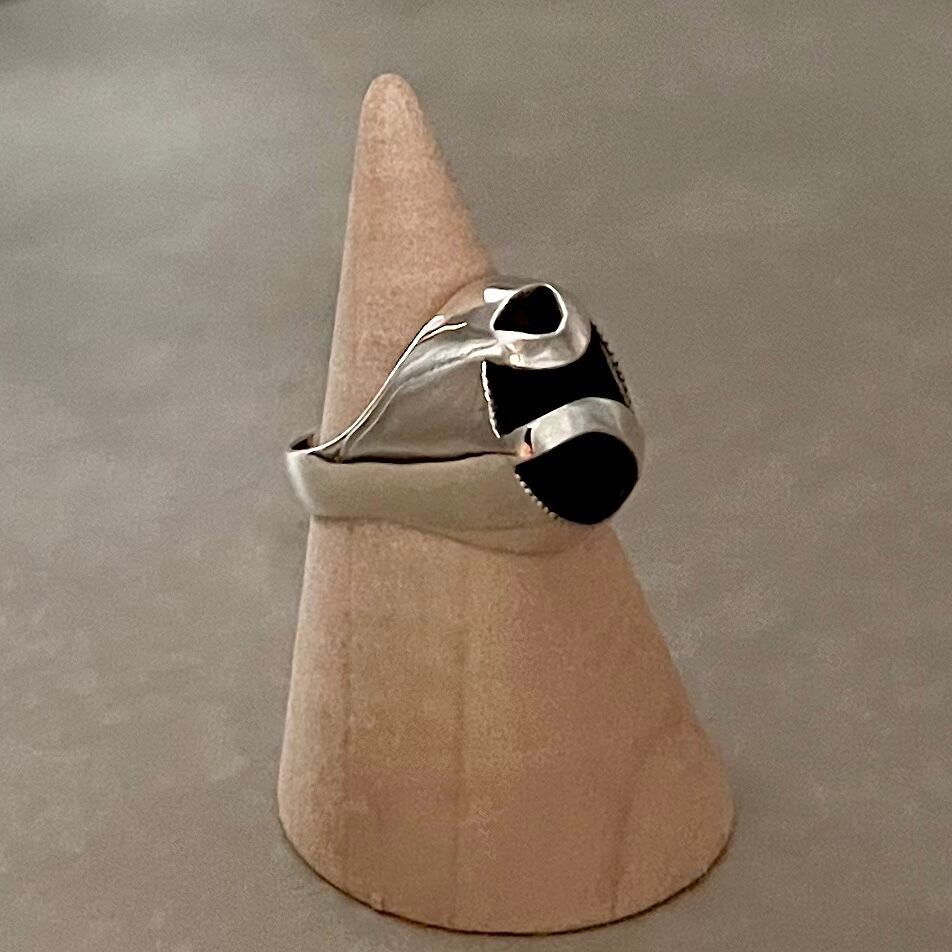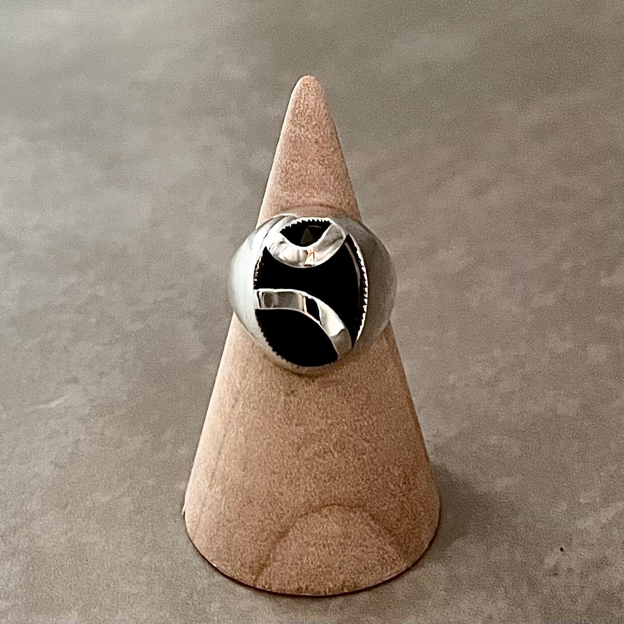 シルバー地金の輝きと、大粒のオニキスが美しいリングです。存在感があり、手元を一気に華やかに演出します。オニキスは古代から守護石とされ、悪いエネルギーを遠ざけ、ポジティブな気持ちを引き寄せると言われています。一つ一つ手作業で丹念に磨かれた、職人の技が光る逸品です。