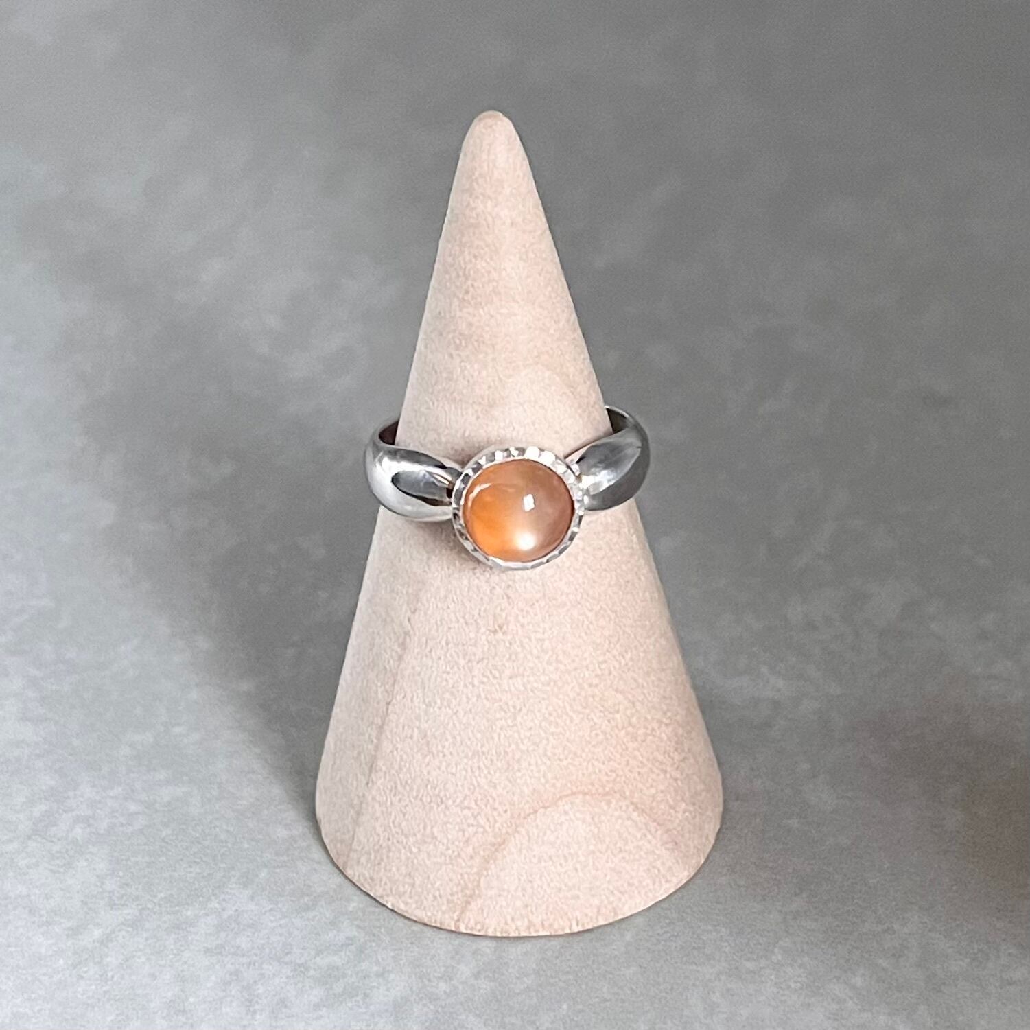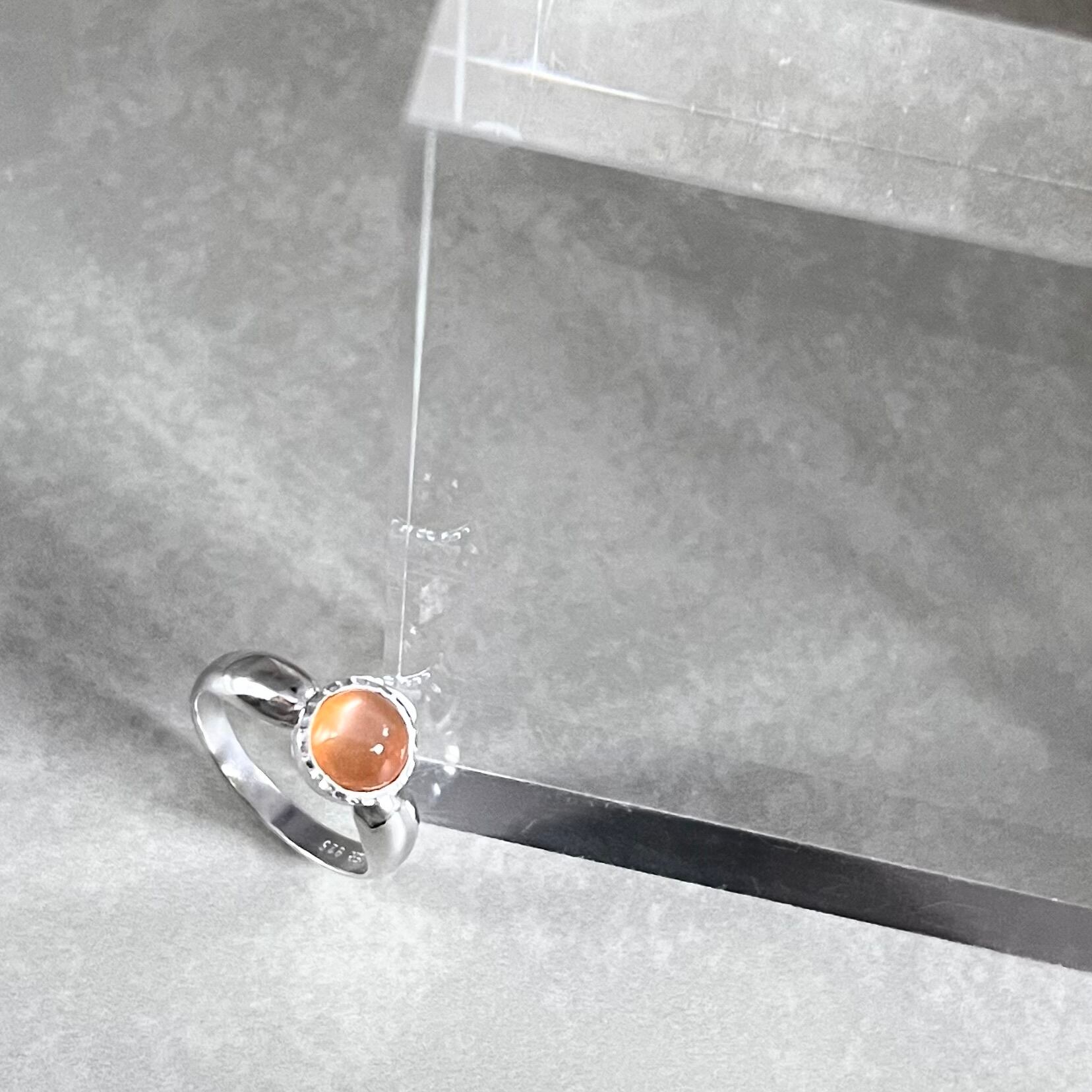 オレンジムーンストーンの輝きが魅力的なシルバーリング。オレンジムーンストーンは、女神の石とも言われ、神秘的なエネルギーを持つとされています。その美しいツヤ感とオレンジ色の輝きは、まるで夜空に浮かぶ満ちた月のよう。指先を飾るだけで、気分も華やかになること間違いなしです。