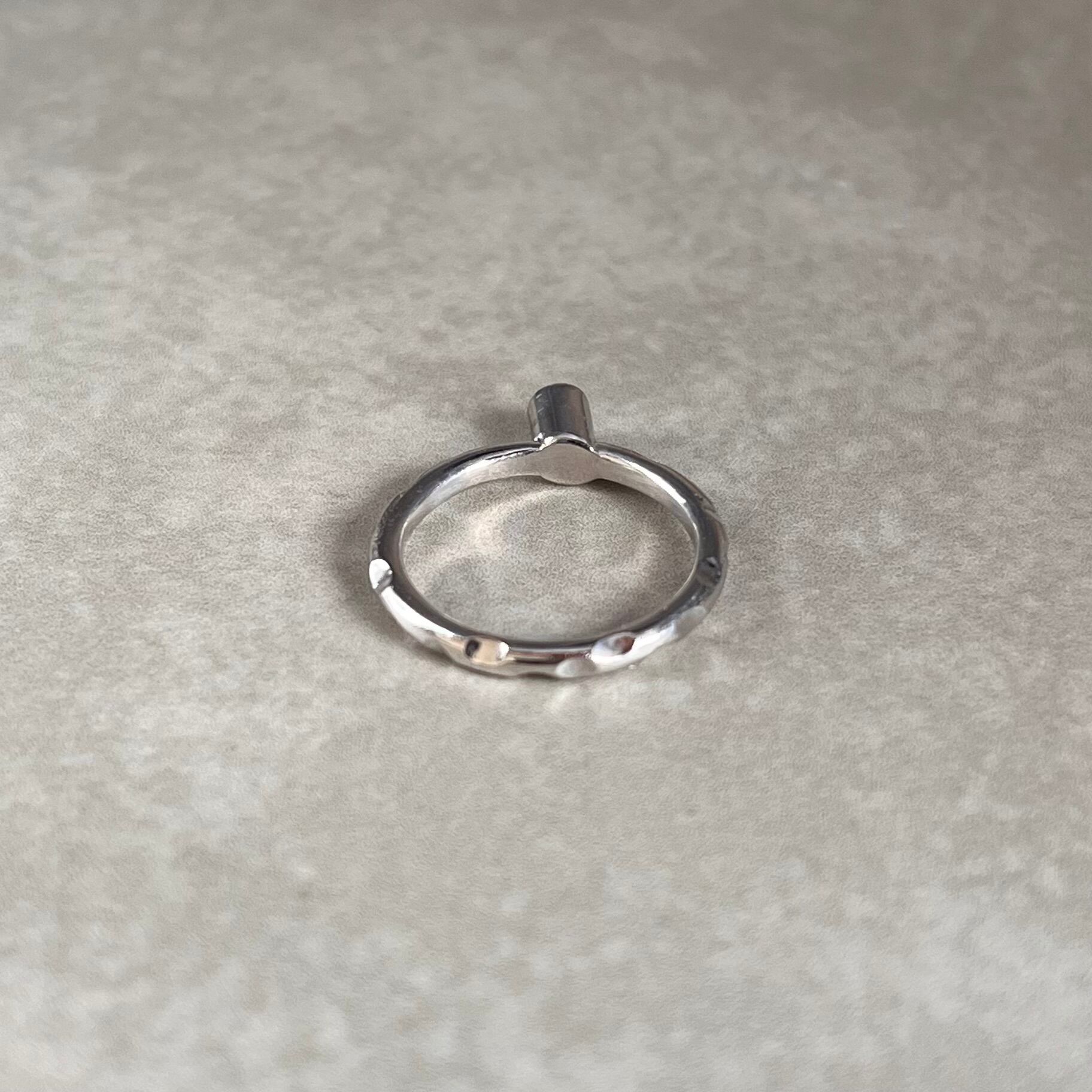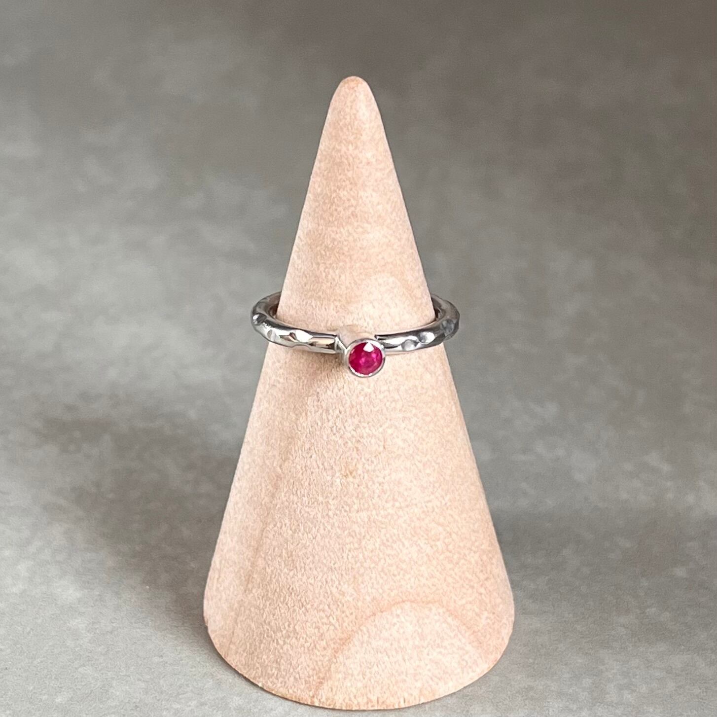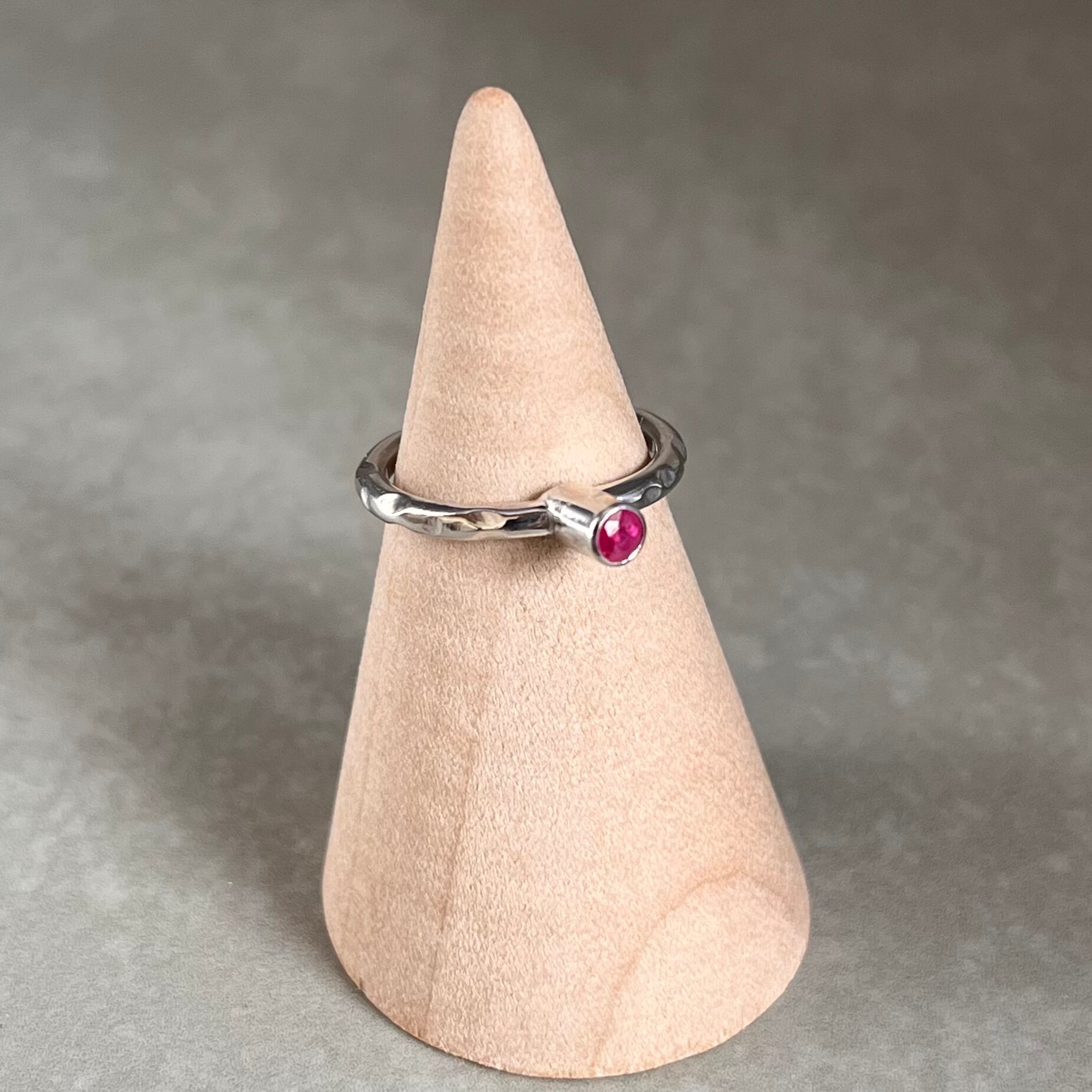 リングのシルバー部分にきらきらと光るルビーが、まるでろうそくに灯されたような美しいデザインのリングです。凹凸の加工が施されたリングが、指先をエレガントに飾ってくれます。シンプルな中にも華やかさを演出できるので、普段使いから特別な日まで幅広くお使いいただけます。