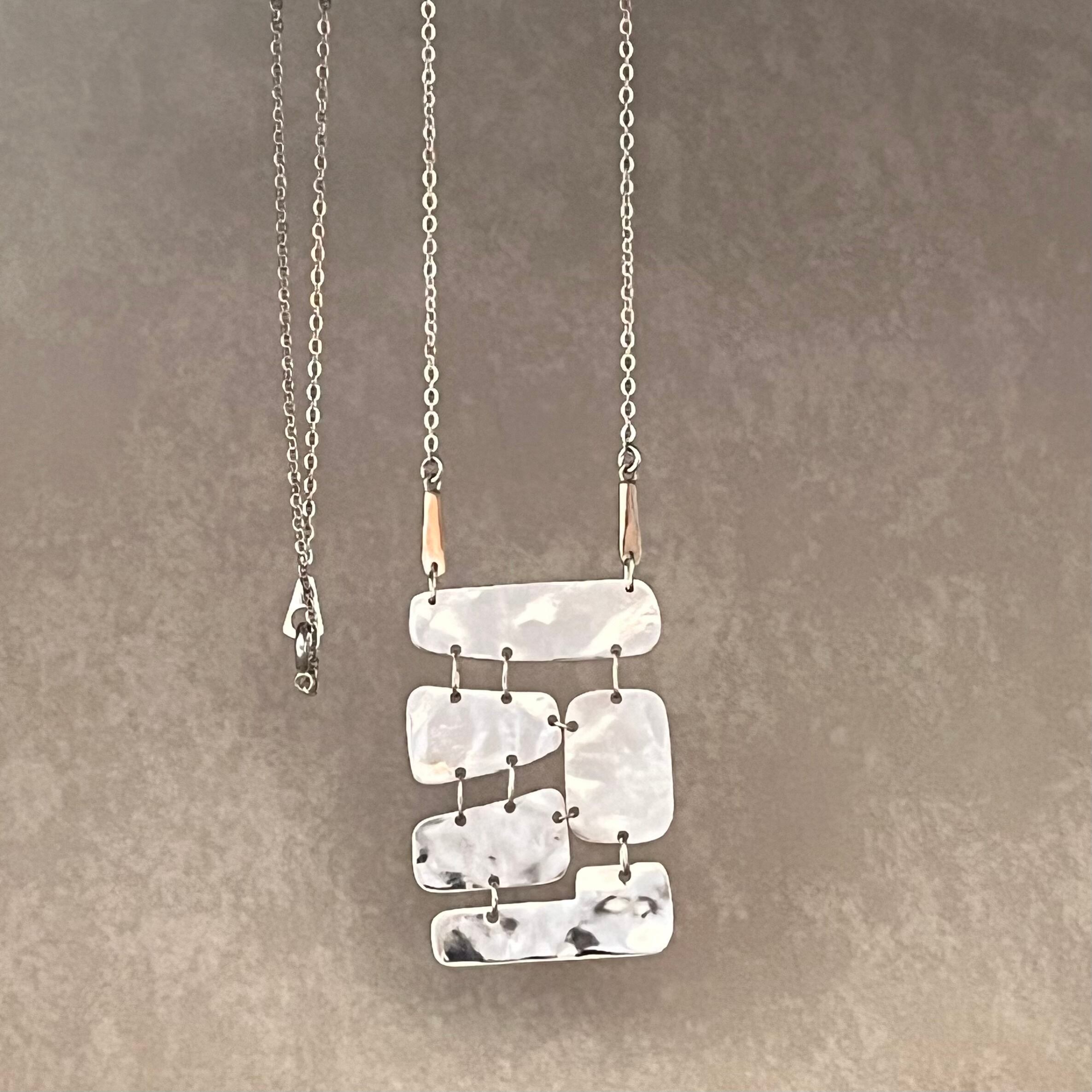 パッチワークシルバーネックレスは、暖かみのある素材感と独創的なデザインが魅力的なアクセサリーです。シルバー地金の輝きが美しく、パッチワーク模様がアートのような個性を引き立てます。洗練されたファッションセンスを演出し、日常のコーディネートにアクセントを加えることができます。