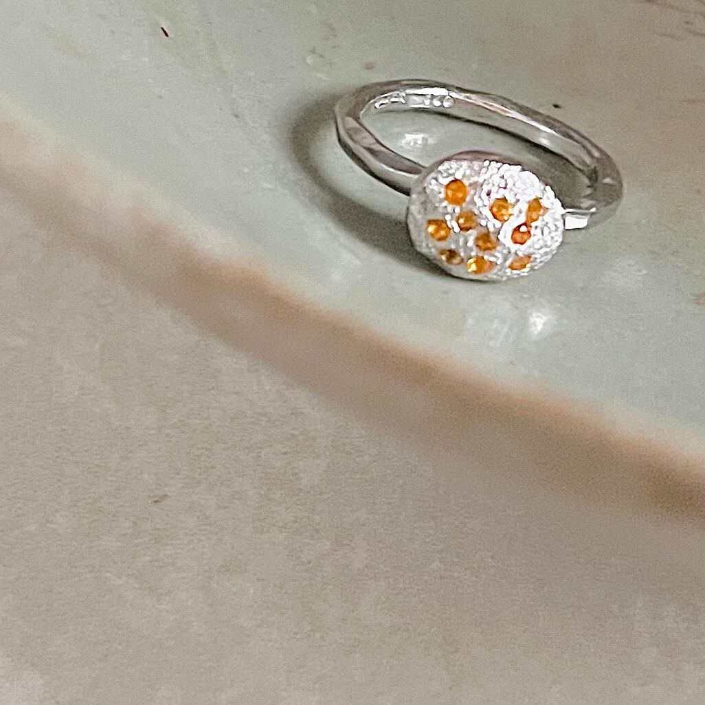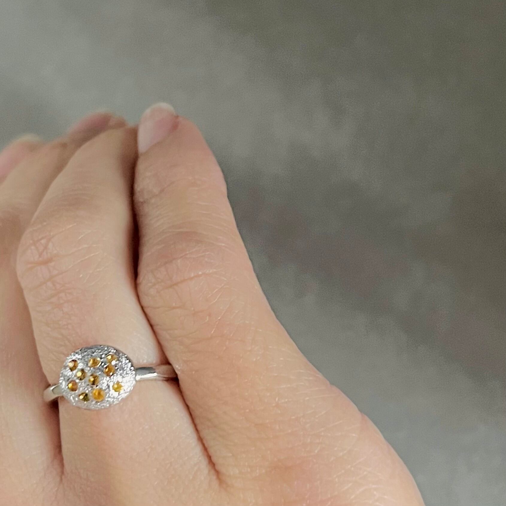 シトリントパーズの輝きが魅力のボールリング。シンプルなデザインながらも、純銀のボールに散りばめられたシトリントパーズが存在感を放ちます。このリングは、普段使いからパーティーシーンまで幅広く活躍するアイテムです。