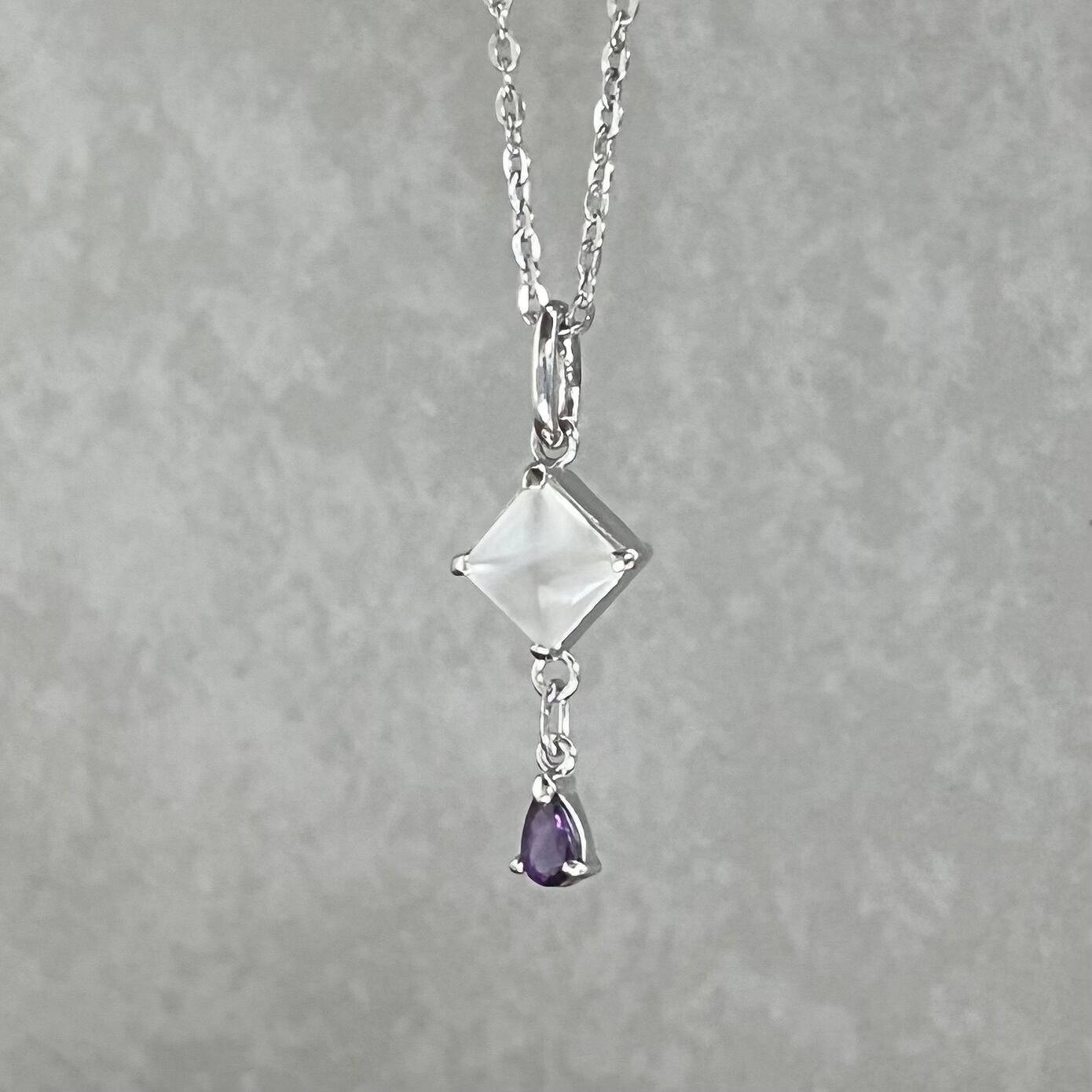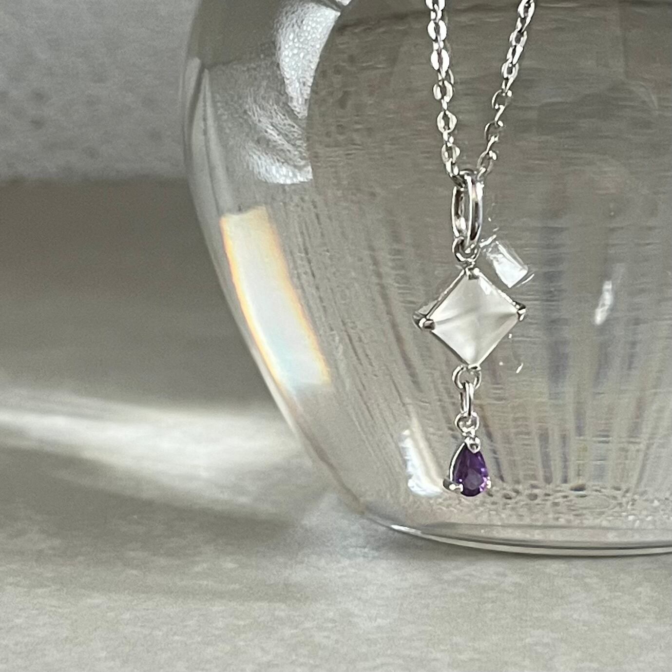 月夜に浮かぶ月と、そっと落ちる雫。その美しいイメージを形にしたネックレスが登場しました。透明感あふれるムーンストーンと、儚さを感じさせる雫型のアメジストが、まるで夢の中にいるような不思議な魅力を放っています。