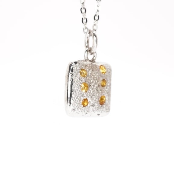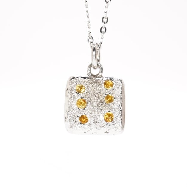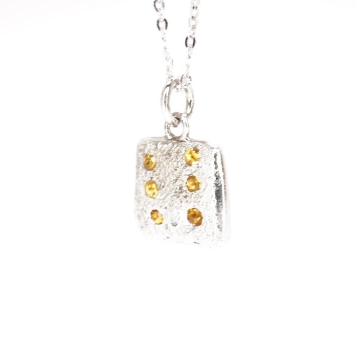 日常のコーディネートにさりげなく取り入れることで、今までとは違った華やかさを演出してくれること間違いなし!シトリントパーズと純銀のサイコロネックレスは、今までのアクセサリーとは一味違ったオシャレを楽しみたい方にぴったりの一品です。