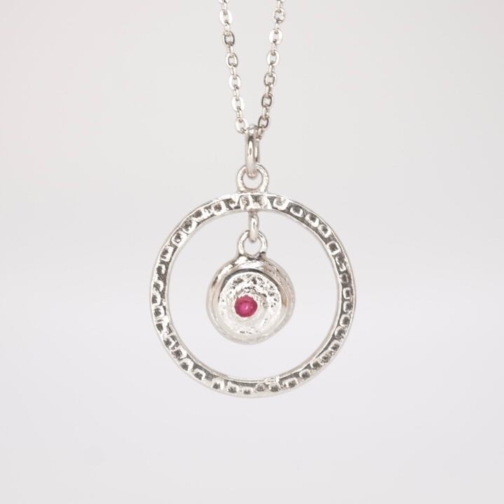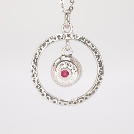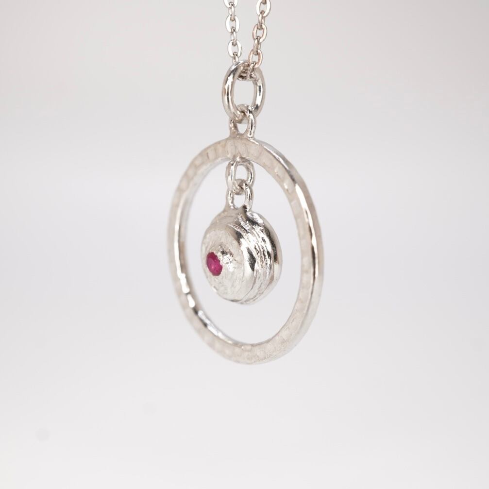 シンプルながらも存在感のあるリングとボールが絶妙に組み合わさった、可愛らしいネックレスです。リングには凸凹加工が施され、ボールは揺れるたびに煌めきを放ちます。ルビーの美しい赤が、華やかさをプラスしてくれるアイテムです。洋服のスタイリングにも合わせやすく、どんなシーンにもマッチするデザインです。