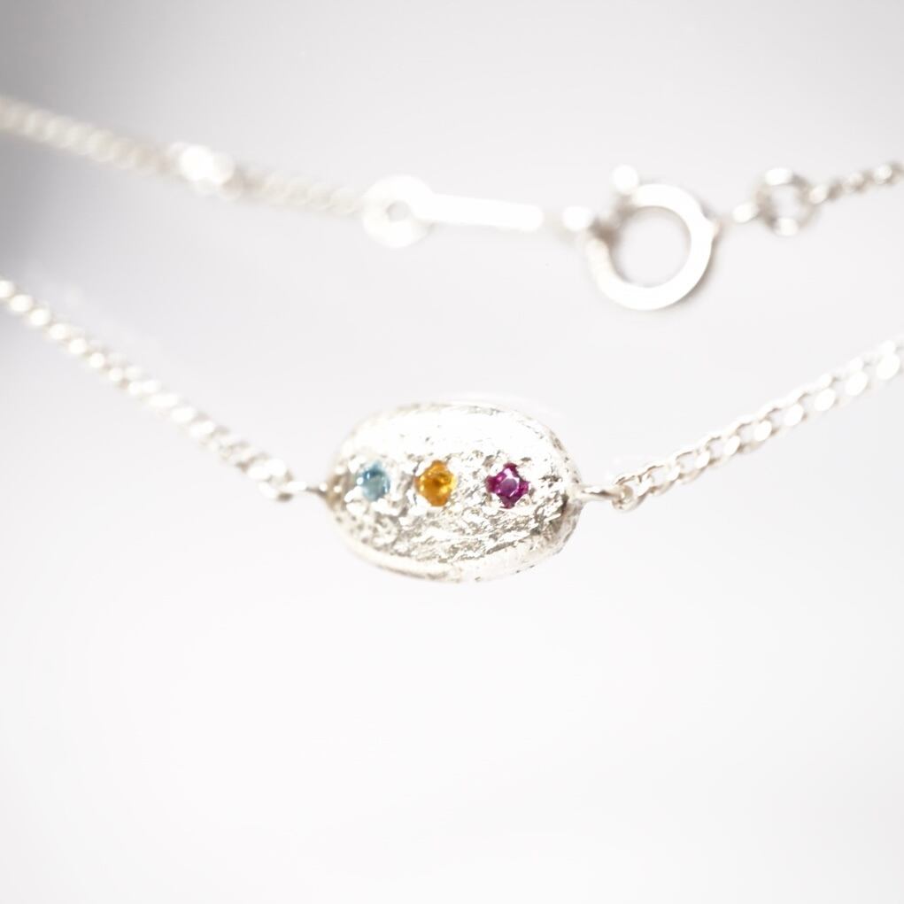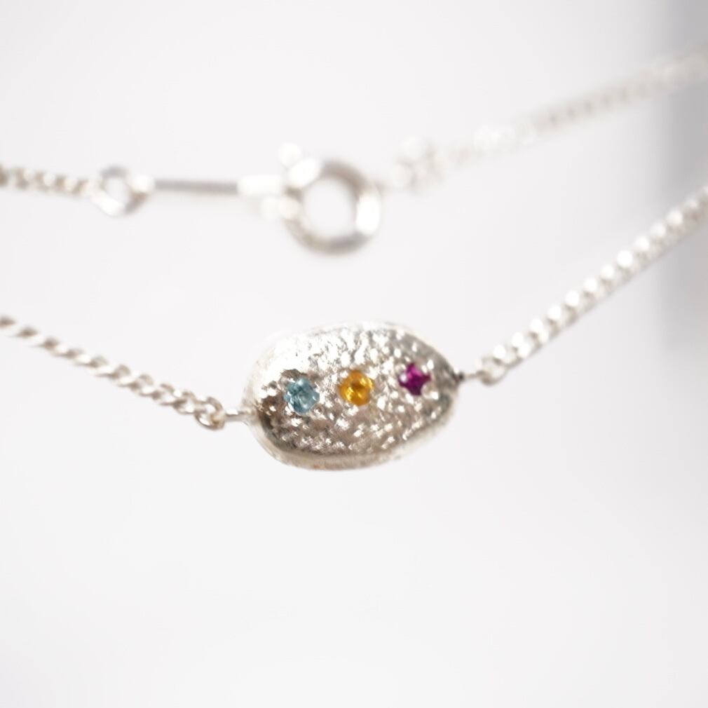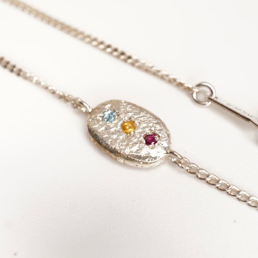 信号カラーのブレスレットは、ルビー、シトリン、ブルートパーズの美しい色合いが特徴のアクセサリーです。シンプルで使いやすいデザインながら、存在感のあるカラーリングがお洒落さを引き立てます。どんなコーディネートにも合わせやすく、日常使いから特別なシーンまで活躍するブレスレットです。
