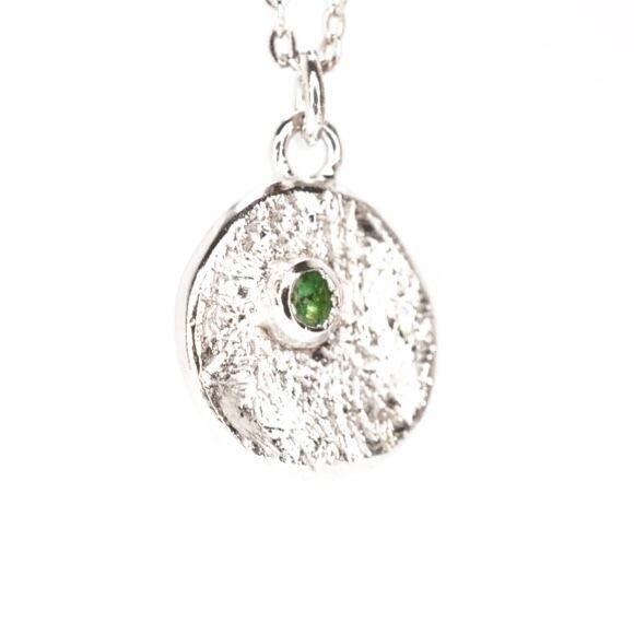 輝くエメラルドがアクセントになった、純銀のコイン型ネックレス。シンプルでありながら存在感のあるデザインは、どんなコーディネートにも合わせやすく、一つでサマになるアイテムです。エメラルドの緑色が美しく輝き、装いに華やかな彩りを添えます。