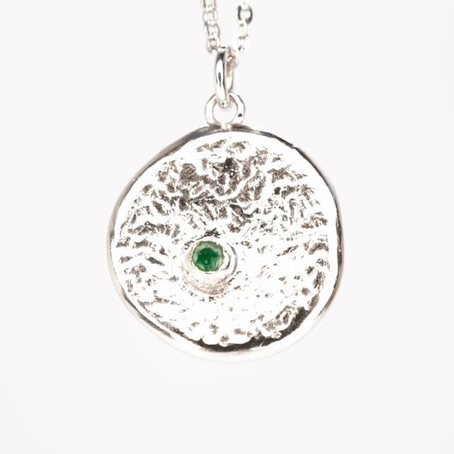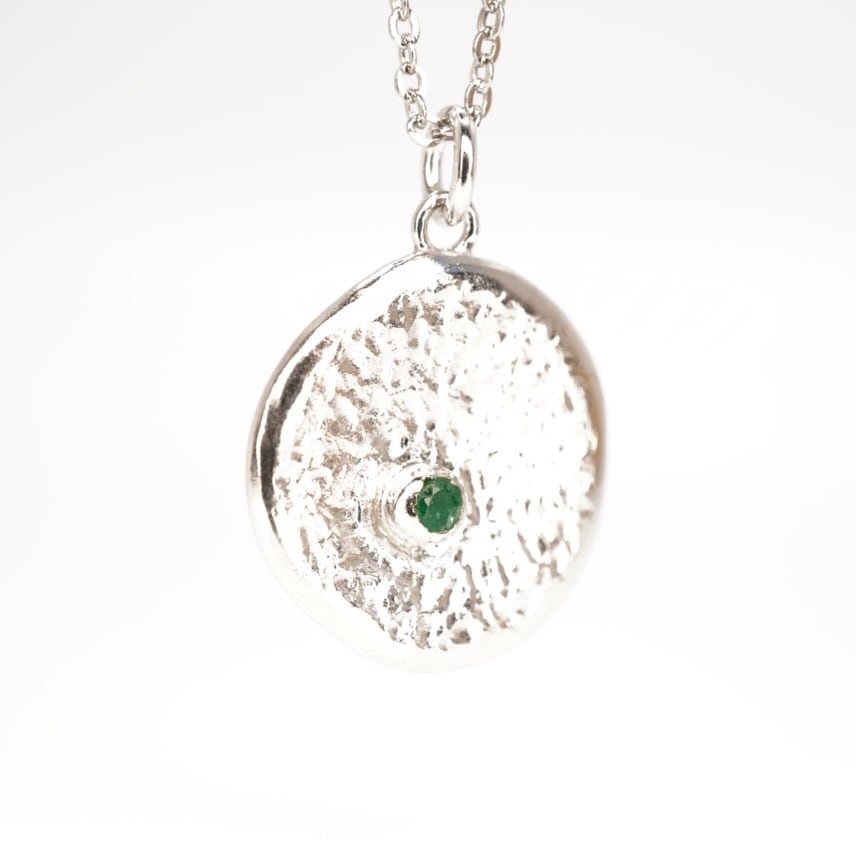 エメラルドの輝きが魅力の純銀ネックレス。シンプルなコイン型デザインで、どんなコーディネートにもマッチします。エメラルドの美しいグリーンカラーが、華やかさと上品さをプラスしてくれます。