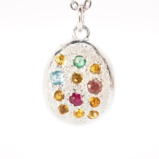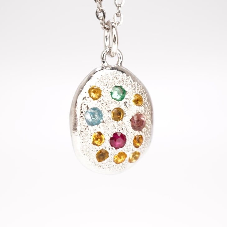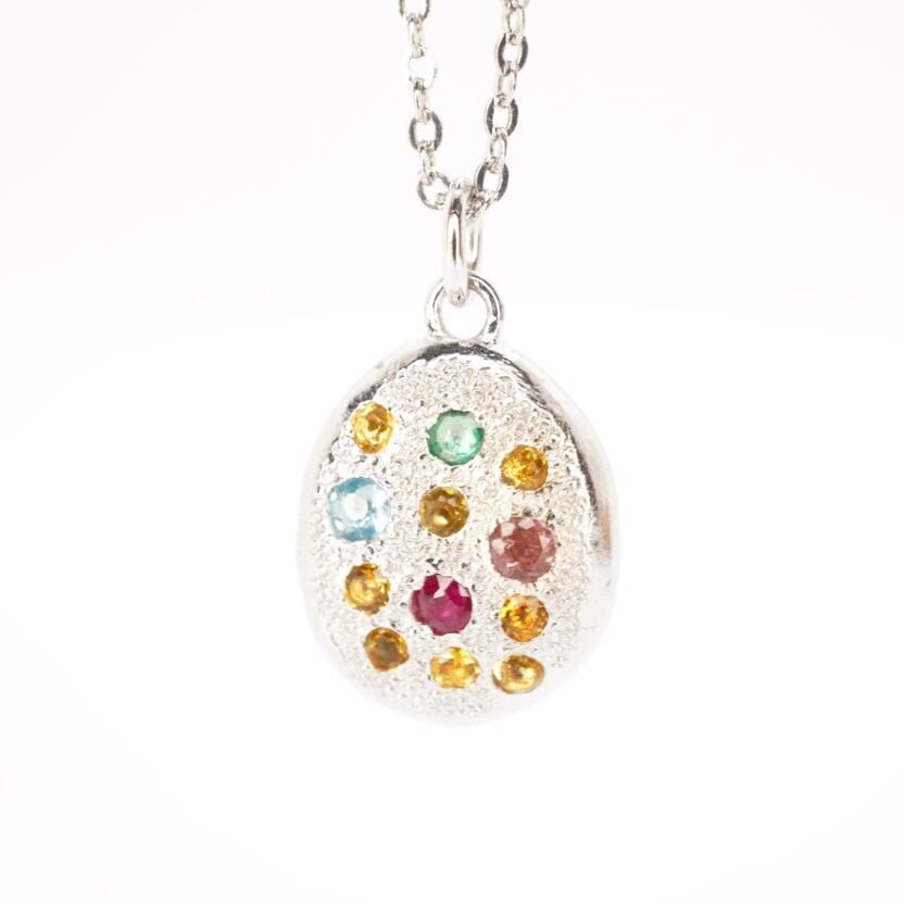 この純銀ネックレスは、一つ一つ丁寧に職人によって手作業で作られています。カラーストーンの輝きが際立つように、緻密に設計されたデザインは、見る者を魅了します。身に着けることで、自信を持ち、輝きたいという気持ちを後押ししてくれることでしょう。