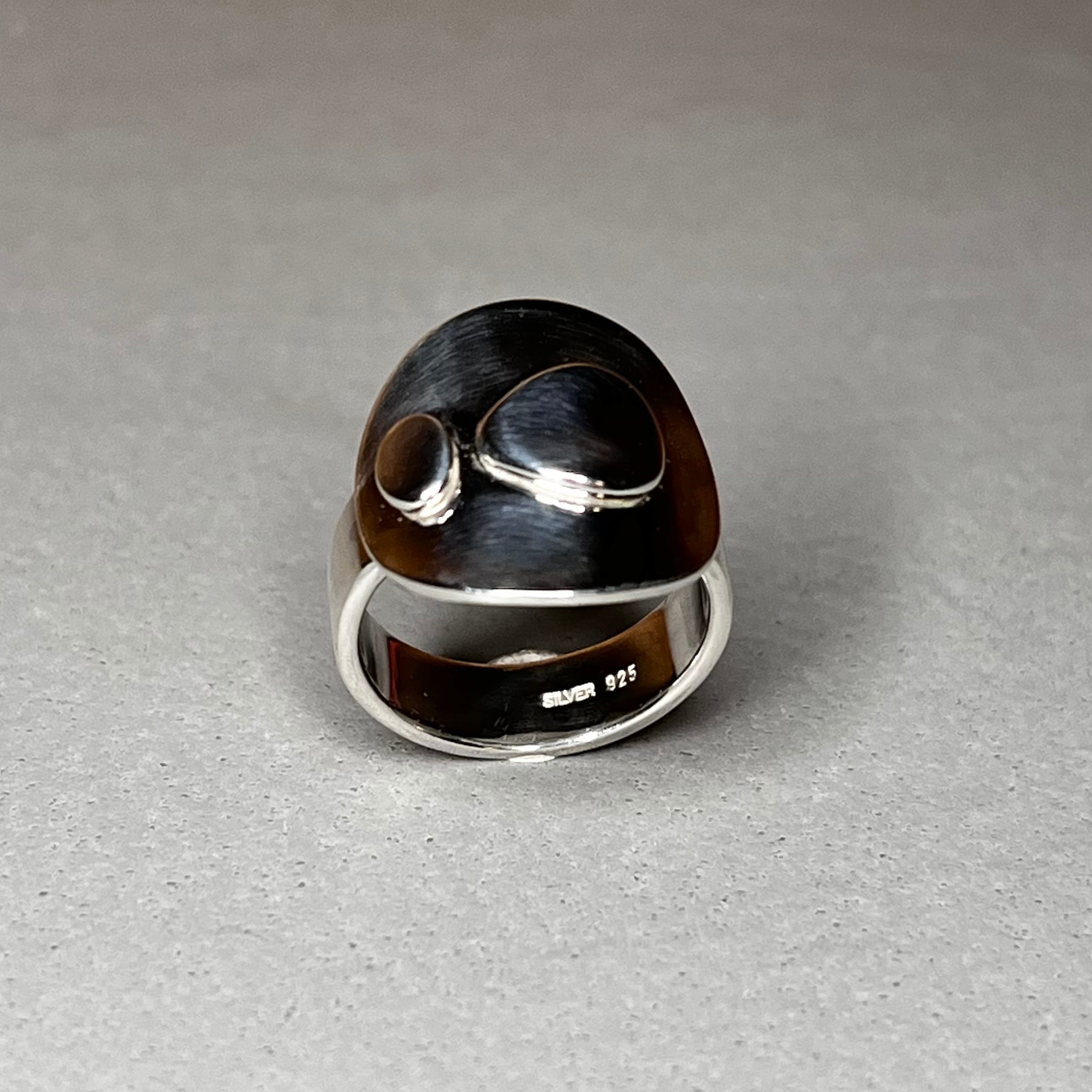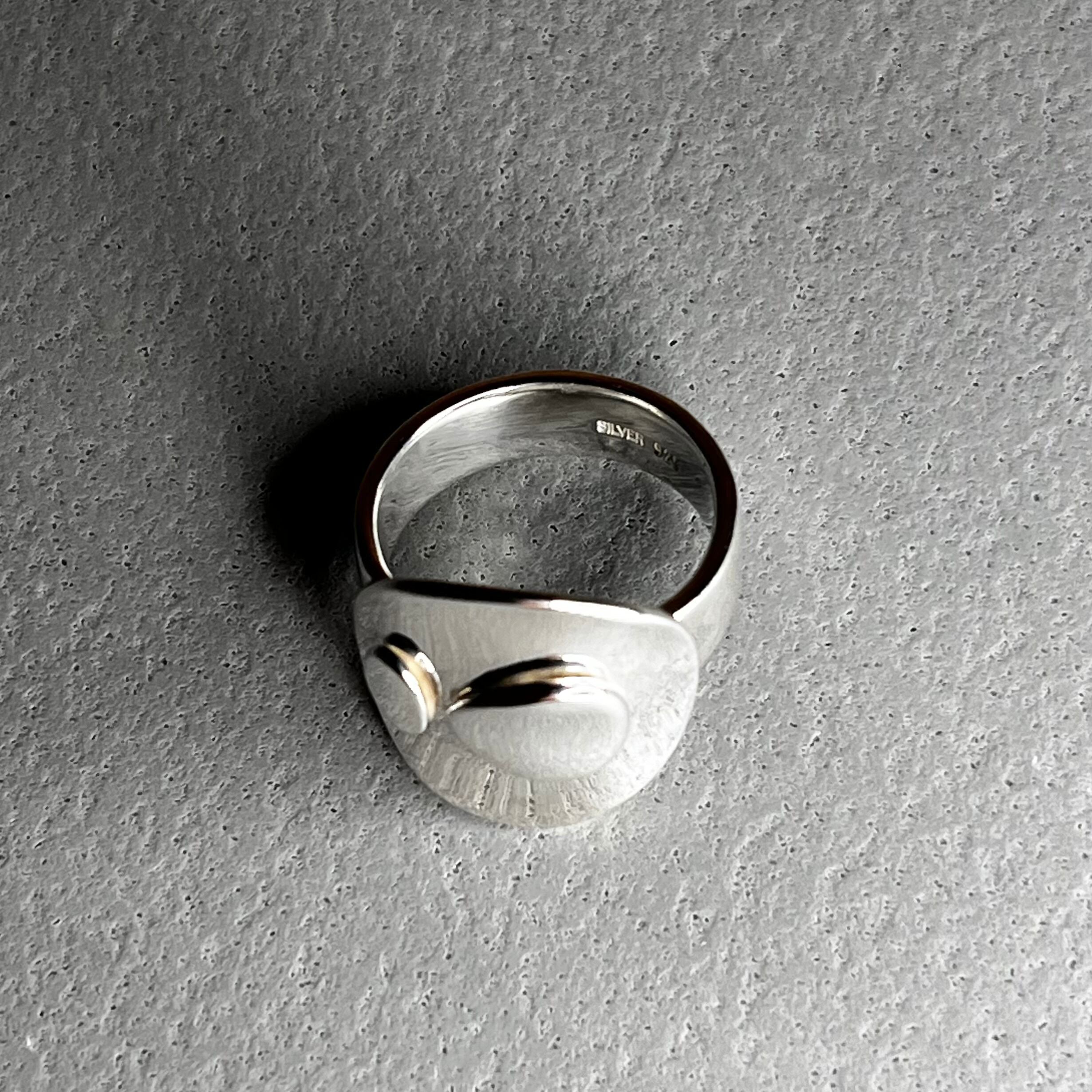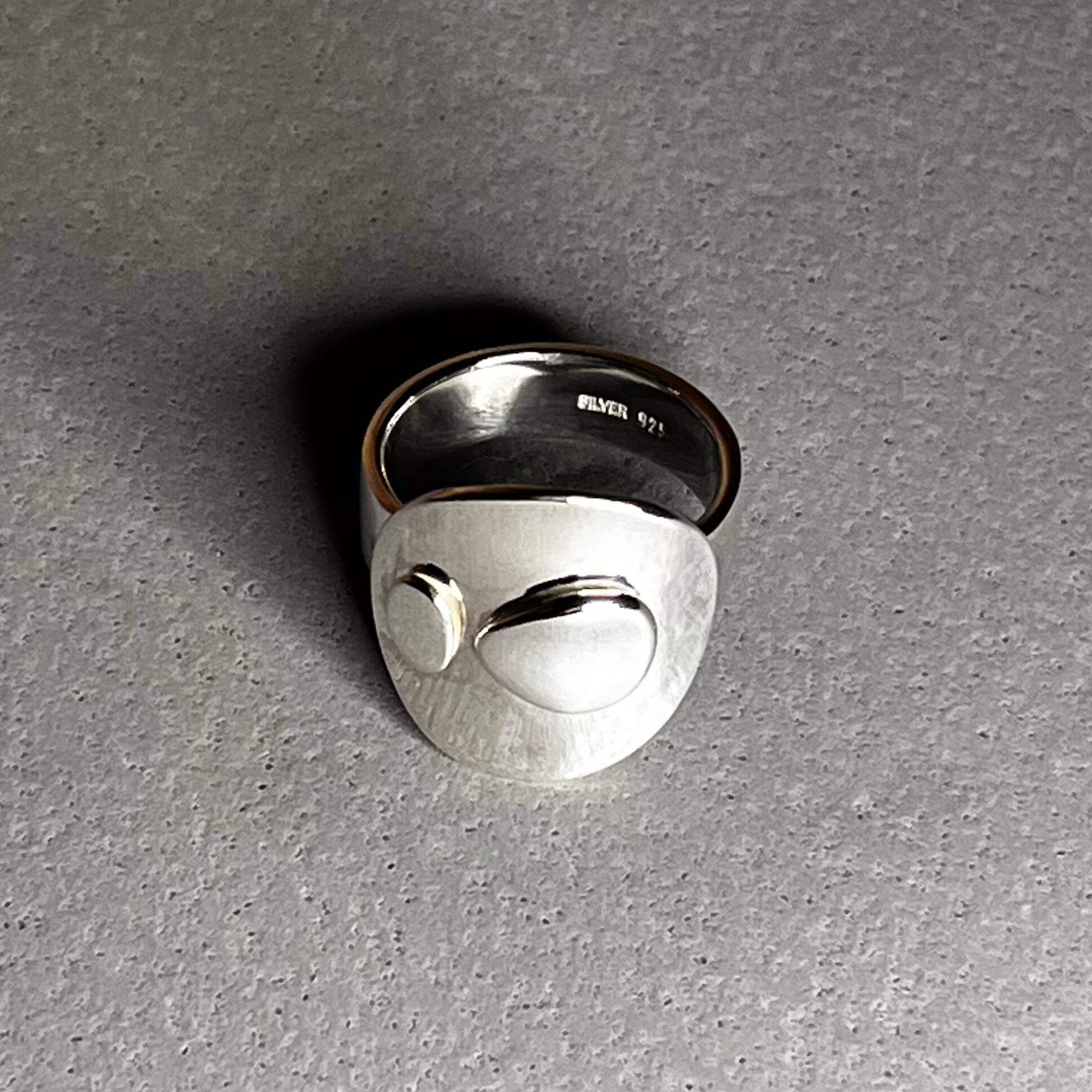 円プレートのシルバーリングは、シンプルでありながらも存在感のあるアクセサリーです。円形のプレートに2枚のコインが乗せられたデザインは、どこか洒落た雰囲気を醸し出しています。シルバー素材のツヤ感が素晴らしく、高級感を漂わせるリングは、どんなコーディネートにも合わせやすく、幅広いスタイルにマッチすること間違いなし。