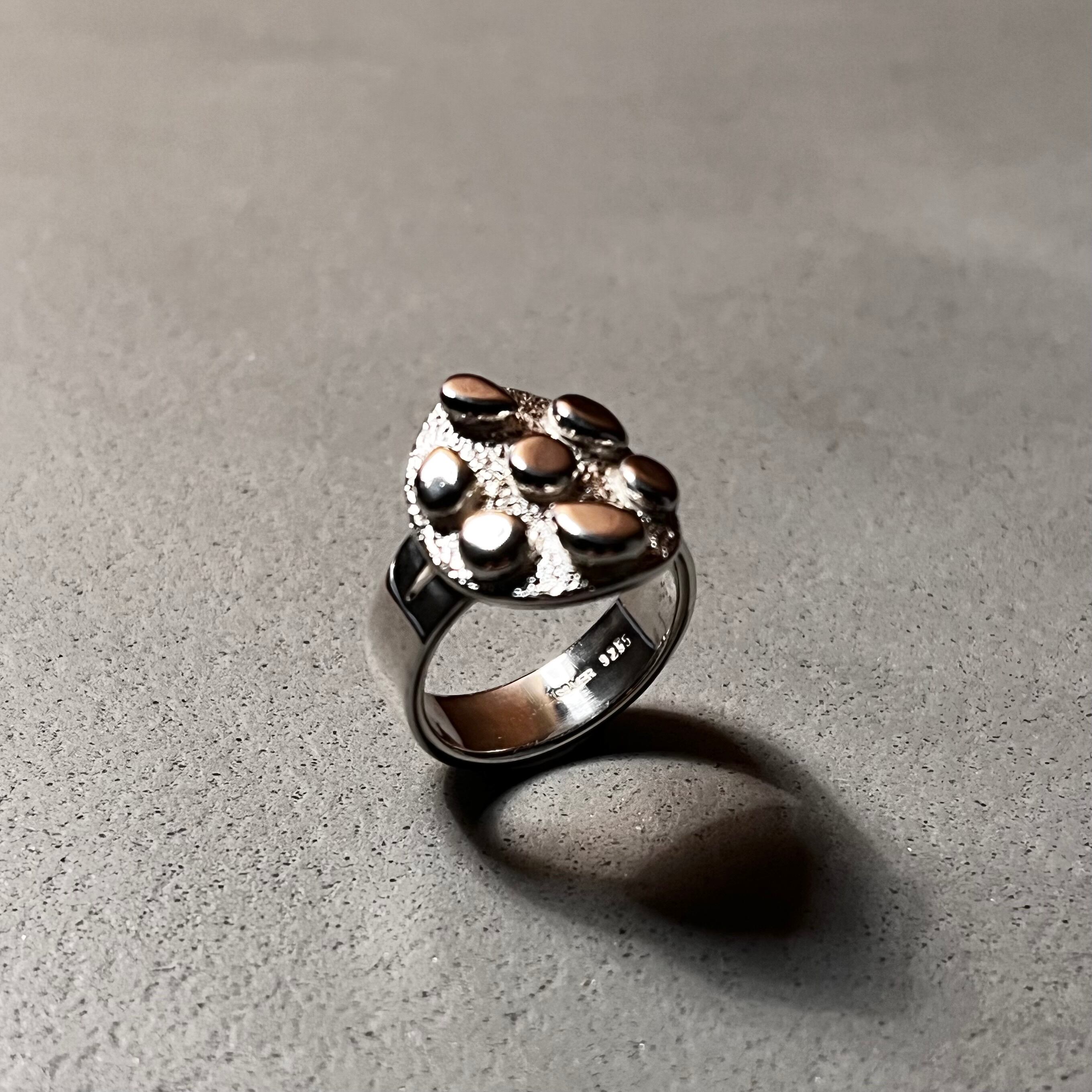 水玉のシルバーリングは、個性的でおしゃれなアイテムとしておすすめです。円プレートにシルバーを水玉模様に施したデザインは、どんなスタイルにも合わせやすく、存在感があります。ポコポコとした触り心地も面白く、身に着けると手元が華やかになります。シルバー素材なので、長く愛用できる耐久性も魅力的です。