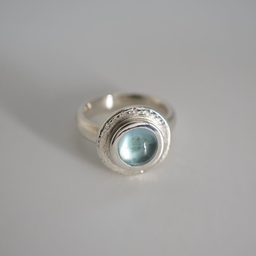 ブルートパーズのシルバーリングは、存在感抜群のアクセサリーです。ブルートパーズの透明感とシルバーの輝きが調和した、シンプルで洗練されたデザインが特徴。大きめリングで、指先を華やかに演出します。