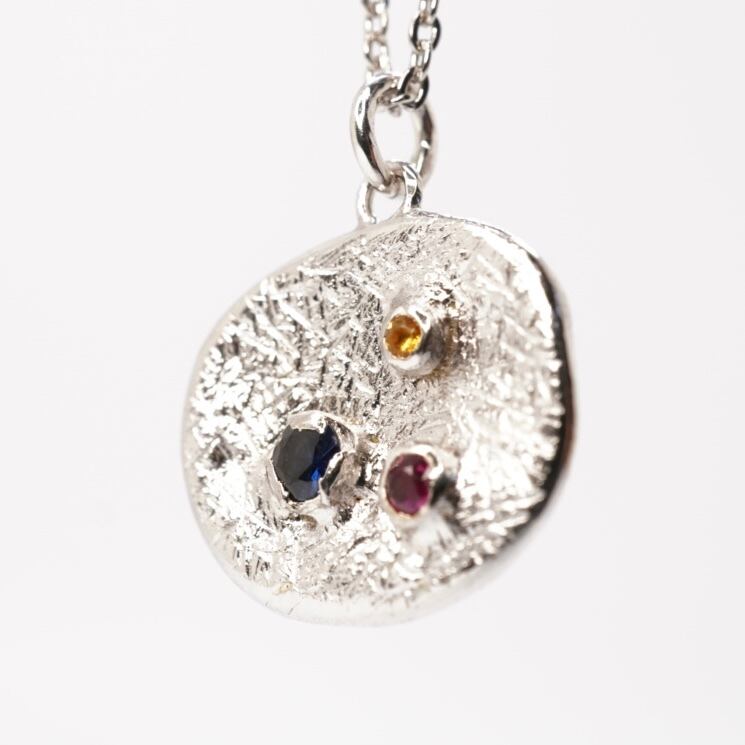 サファイア、ルビー、シトリン、3石の純銀ネックレスは、色鮮やかな宝石と上質な純銀素材が調和した一点ものです。コイン型のデザインがシンプルでありながらも存在感抜群。どんなコーディネートにも合わせやすく、幅広いシーンで活躍します。
