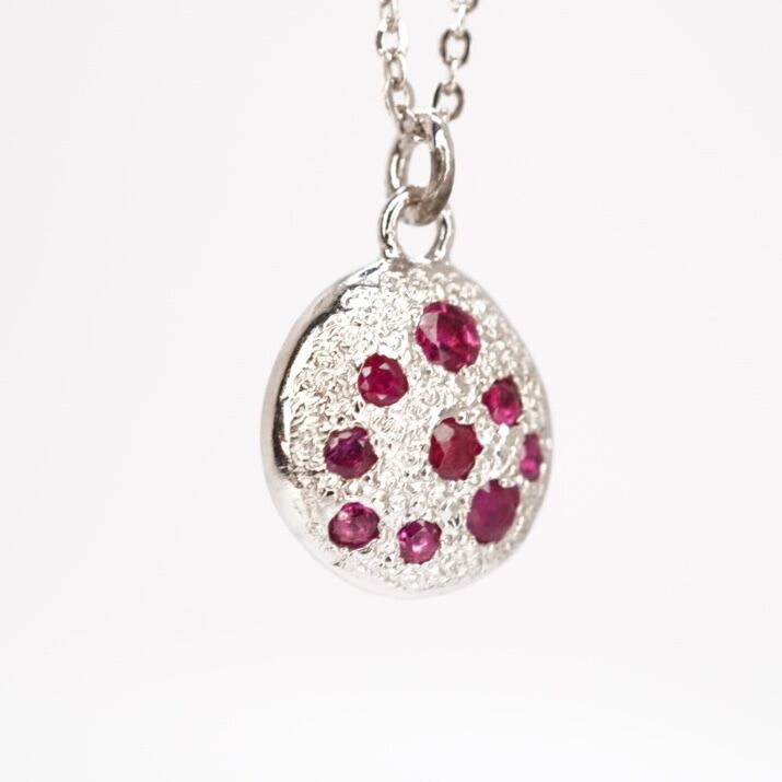 ルビーと純銀のネックレスは、小粒でありながら存在感がある一品です。女性らしさとシンプルさを兼ね備えたデザインは、どんな装いにも合わせやすく、万能なアクセサリーとして活躍します。ルビーは愛と情熱の象徴と言われており、身に着けることで女性らしい魅力を引き出してくれることでしょう。