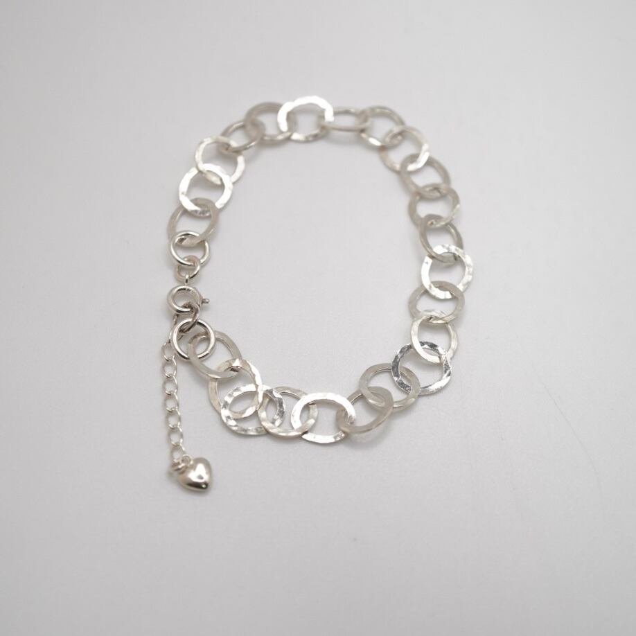 リングチェーンブレスレットは、たたき加工が施されたシンプルで美しいデザインが特徴のアクセサリーです。シルバー925を使用しているため、上質な輝きと耐久性が魅力です。軽やかな着け心地で、日常使いはもちろん、パーティーシーンでも活躍するアイテムです。