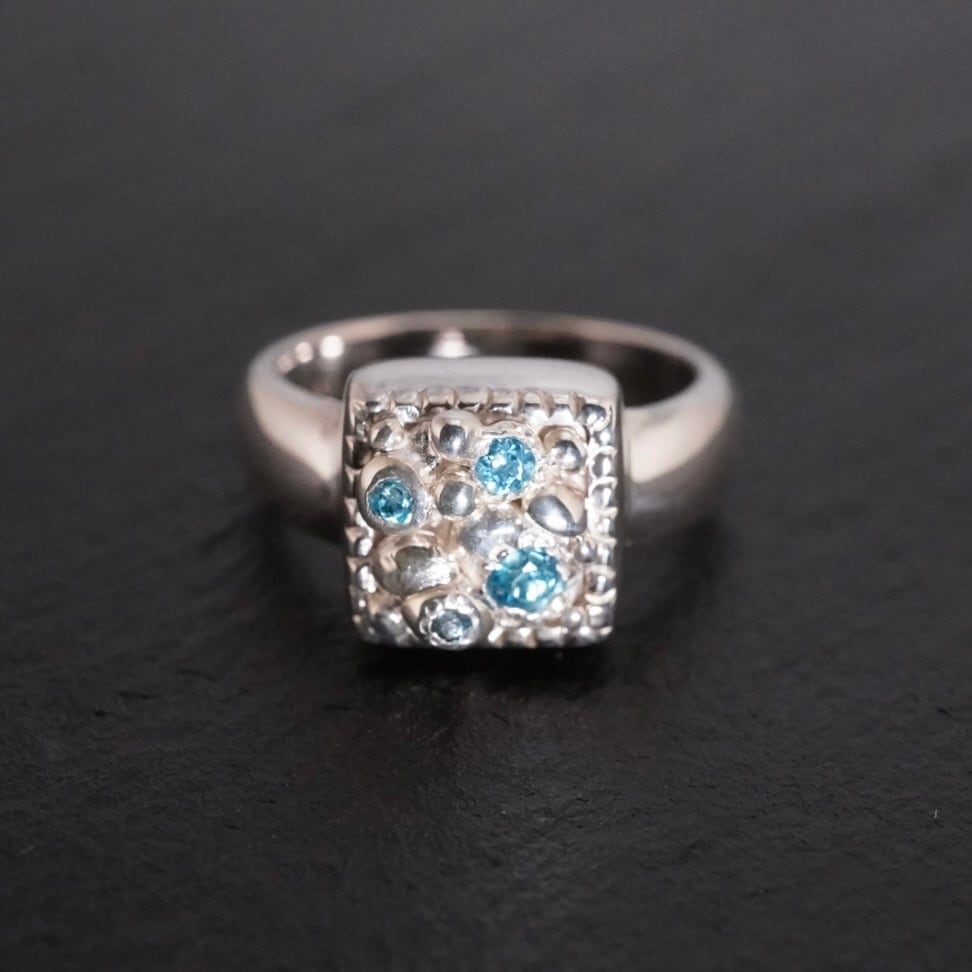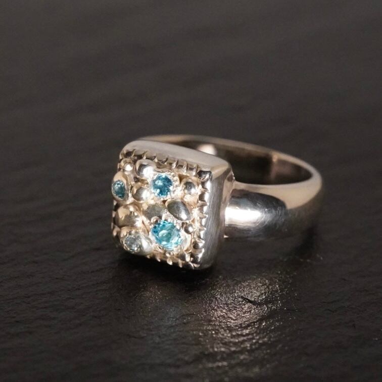 美しい「スクエアリング」が新たに登場しました。小粒ブルートパーズのきらめきが、指元に華やかさを添えつつ、エレガントで洗練された印象を与えます。このリングは、日常使いにも特別なシーンにもぴったりで、あなたの個性を際立たせるアイテムです。